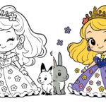 可愛らしいプリンセスが動物たちと並ぶ、心温まる塗り絵イラスト。華やかなドレスと柔らかな色彩が、子どもから大人まで楽しめる優しい雰囲気を演出します。癒しのひとときにぴったりの作品です。