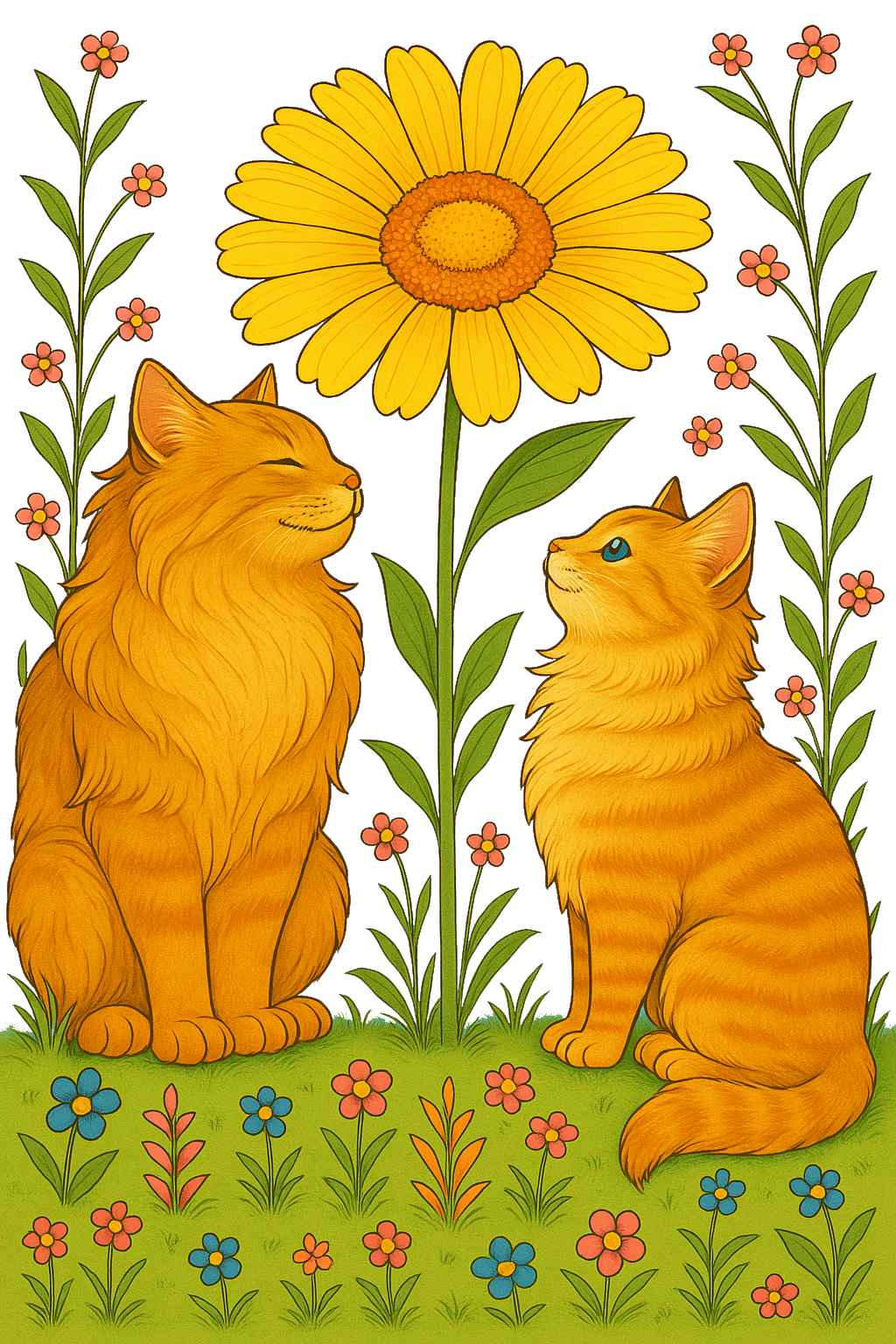 この塗り絵は、朝日に照らされるひまわりの下で寄り添う2匹の猫を描いた、やさしさと希望に満ちた一枚です。ふわふわの毛並みが丁寧に描かれた親子のような猫たちが、穏やかなまなざしを交わし、背景には小さな草花が静かに咲いています。色を塗ることで、陽光のぬくもりや、自然の豊かさを感じさせてくれる、心安らぐ作品です。