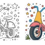 カラフルな三輪車が星空の下で輝くように描かれた、可愛らしいイラストの塗り絵です。ピンクやオレンジ、ブルーの鮮やかな色合いに包まれ、子どもの遊び心を感じさせる温かい雰囲気。楽しさあふれるデザインを自由に彩ってみてください。