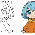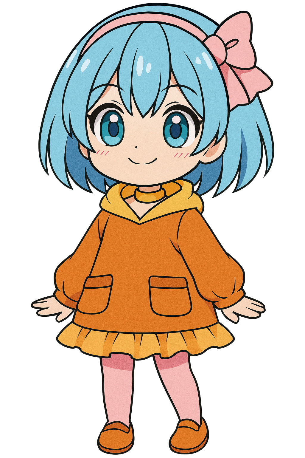 大きなリボンが愛らしい水色の髪の女の子が、オレンジのワンピースを着てにっこり微笑む塗り絵イラストです。シンプルで塗りやすい線画ながら、鮮やかな色合いに仕上げられるデザインで、お子さまから大人まで楽しめます。自由な発想で色を重ね、個性あふれる一枚に仕上げてみてください。
