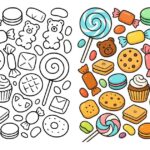 カラフルなお菓子がいっぱい!クッキーやマカロン、キャンディなどを集めた楽しい塗り絵素材。色を塗りながら甘い世界を楽しめます。