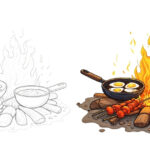 焚き火の上で目玉焼きや煮込み料理、串焼きがじっくりと焼かれるキャンプシーンを描いた塗り絵です。薪のぬくもりや炎の揺らぎ、香ばしい料理の雰囲気まで想像しながら色を塗れば、アウトドア気分がぐっと高まります。自然の中での食事の楽しさと、火のぬくもりを感じさせる一枚です。心地よいリラックスタイムにぴったり。