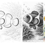 珊瑚礁の海をゆったりと泳ぐクマノミを描いた、繊細な線画の塗り絵です。細やかな鱗やヒレの質感、周囲の珊瑚や気泡まで丁寧に表現され、海中の静かな雰囲気が広がります。陰影を重ねることで、立体感と奥行きをじっくり楽しめる一枚です。