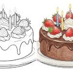チョコレートがとろりと溶け、甘い香りが漂ってきそうな誕生日ケーキの塗り絵です。いちごやキャンドルなど細かいパーツが多く、じっくり味わいながら塗れるデザイン。完成すると華やかな作品になります。