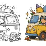 元気な青年が黄色いワゴン車を運転し、屋根の上にはカラフルなボトルや野菜が積まれています。楽しい冒険の始まりを感じさせるポップな塗り絵で、子どもも大人も夢中になれる一枚です。