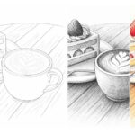 いちごのショートケーキとラテを描いた、落ち着いた雰囲気の塗り絵です。ケーキの層やクリーム、カップの質感、木目のテーブルまで丁寧に表現されています。陰影を重ねながら、やさしいカフェ時間を思い浮かべて彩れる一枚です。