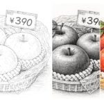 かごに丁寧に並べられたみずみずしいリンゴを描いた塗り絵です。水滴や葉の質感、編み目の細かな表現まで楽しめる一枚。価格札がアクセントとなり、素朴な市場の雰囲気を感じながら、陰影づけや色の重なりをじっくり味わえます。