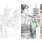 古い町並みと五重塔を背景に、着物姿の女性を描いた和風の線画塗り絵です。繊細な着物の柄や石畳の表現まで丁寧に描かれ、落ち着いた雰囲気の中でじっくり彩りを楽しめます。日本の情緒を感じながら取り組める、大人向けの一枚です。