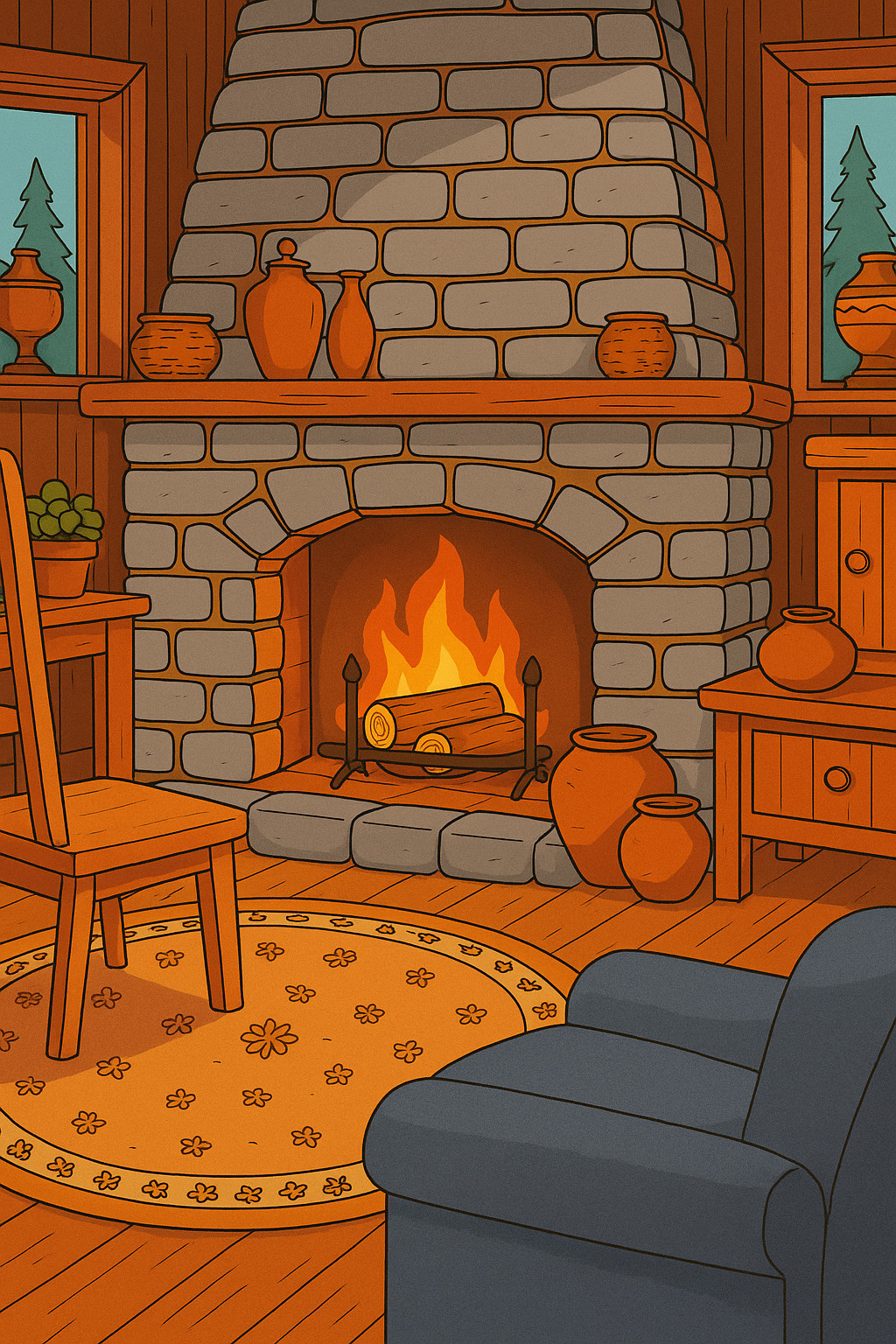 暖炉の炎が優しく揺らめく、木の温もりあふれる部屋を描いた塗り絵。石造りの暖炉や木製の家具、陶器の壺など細部まで丁寧に描かれ、大人がじっくり色を重ねる楽しさを味わえます。リラックスしながら心落ち着く時間を過ごせる作品です。