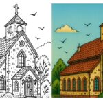 優雅な教会をモチーフにした大人向け塗り絵イラスト。赤茶色の屋根と石造りの壁、緑豊かな庭や可憐な花々が描かれ、心を落ち着けながら自分らしい色彩で彩れます。集中力を高めたい時やリラックスしたい時間にぴったりの一枚です。
