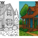 青い壁とレンガ色の屋根が印象的な可愛らしい家を描いた塗り絵です。緑豊かな庭と小道が温かな雰囲気を添え、花々が彩りを加えています。落ち着きと優しさを感じる一枚を自由に彩ってみてください。