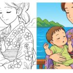 母の腕に抱かれて眠る赤ちゃんと、優しく見守る母の姿を描いた心温まる一枚。水辺の風景と花柄の着物が、穏やかで安心感のある空気を漂わせます。親子の絆を感じながら、落ち着きと癒しを味わえる塗り絵です。