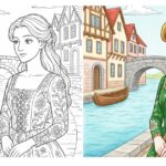 穏やかな運河のほとりに立つ女性が描かれた、爽やかで気品ある塗り絵です。緑のドレスには白い花があしらわれ、自然の優しさと優雅さを感じさせます。背景には赤屋根の家々と石橋、そして静かに浮かぶ小舟が描かれ、まるで中世ヨーロッパの町を旅しているような雰囲気。水面の反射やドレスの陰影を丁寧に塗ることで、奥行きのある美しい一枚に仕上がります。心落ち着く風景と上品な女性像が調和する、物語性豊かな作品です。