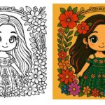 華やかな花々に囲まれた少女が、美しい刺繍模様の緑のドレスをまとい微笑む塗り絵イラスト。大きな瞳とやわらかな髪、そして鮮やかな花飾りが調和し、童話の世界を思わせるような可憐で幻想的な雰囲気を演出します。心を落ち着けながら、自分だけの色彩表現を楽しむことができます。
