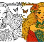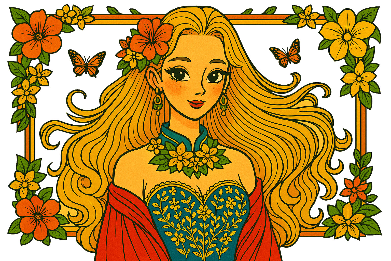 華やかな花々に囲まれ、金色の髪をなびかせる気品ある女性を描いた塗り絵です。胸元の花模様のドレスと首飾りが、自然との一体感と優雅さを際立たせ、周囲に舞う蝶がさらに幻想的な雰囲気を添えています。髪飾りや装飾の細やかなディテールは、彩色の工夫次第で多彩な表現が可能。花と女性の美しさが調和するこのイラストは、心を落ち着けながら自分らしい色彩の世界を楽しめる一枚です。