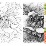 いちごの花にとまるミツバチを精密に描いた塗り絵です。果実の粒や葉脈、羽の透明感まで丁寧に表現され、立体感ある陰影づけを楽しめます。自然の営みを感じながら、細部までじっくり塗り込める一枚です。