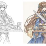 気品あふれる魔法学者が、羽ペンを手に古代の書を綴る姿を描いた幻想的な塗り絵です。机の上にはインク瓶や巻物、砂時計が並び、知識と時の重みを感じさせます。彼女の青と金を基調とした衣装は高貴でありながら繊細な美しさを放ち、足元のフクロウが知恵の象徴として静かに見守ります。金のアクセントや布の陰影を丁寧に重ねることで、知性と優雅さが調和する華麗な世界を表現できる一枚です。