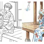 風に揺れる風鈴と、金魚柄の浴衣が印象的な夏の塗り絵です。縁側でゆったり過ごす女性の姿は、どこか懐かしく心が落ち着くような雰囲気。細やかな模様と美しい構図で、塗る楽しさと完成後の満足感が味わえる大人向けの作品です。