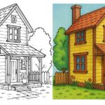 明るい黄色の外壁と赤い屋根が印象的な木造の家を描いた温かみのある塗り絵。庭には鮮やかな花々が咲き、青空の下で心地よい暮らしを想像させます。大人のリラックスタイムにもぴったりの作品で、穏やかな気持ちになれる一枚です。