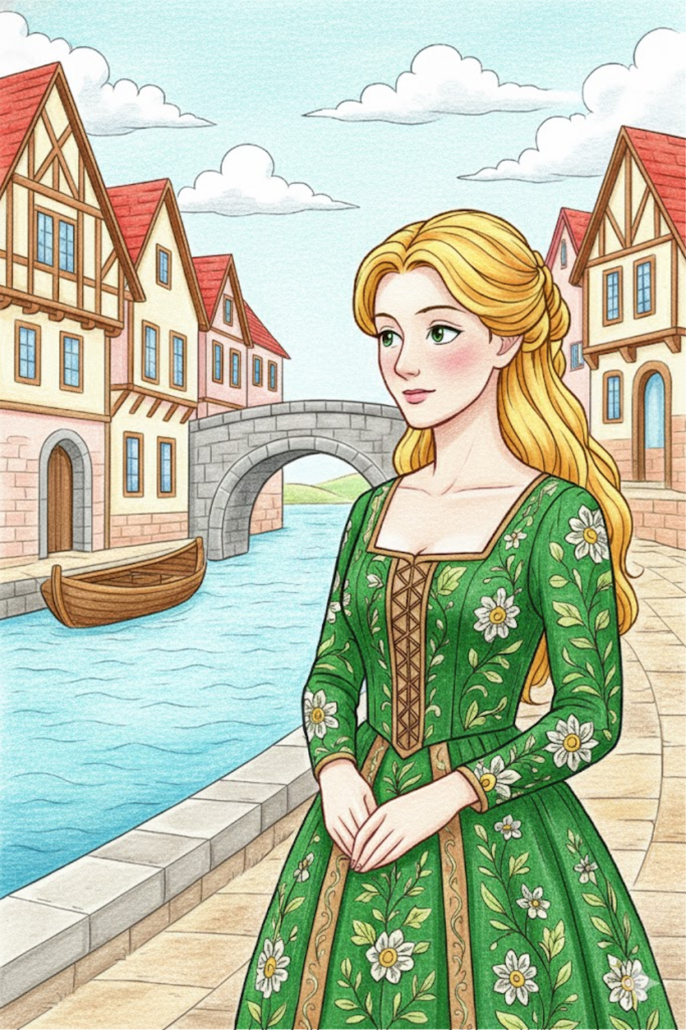 10459-塗り見本-緑のドレスと石橋の街